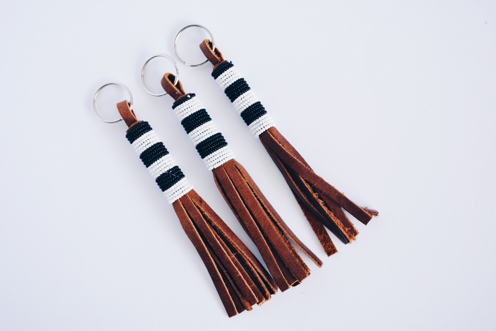 These leather key chain tassels have been hand beaded for Herd of Ubuntu by a gentleman who owns a stall in the markets near Howick Falls.